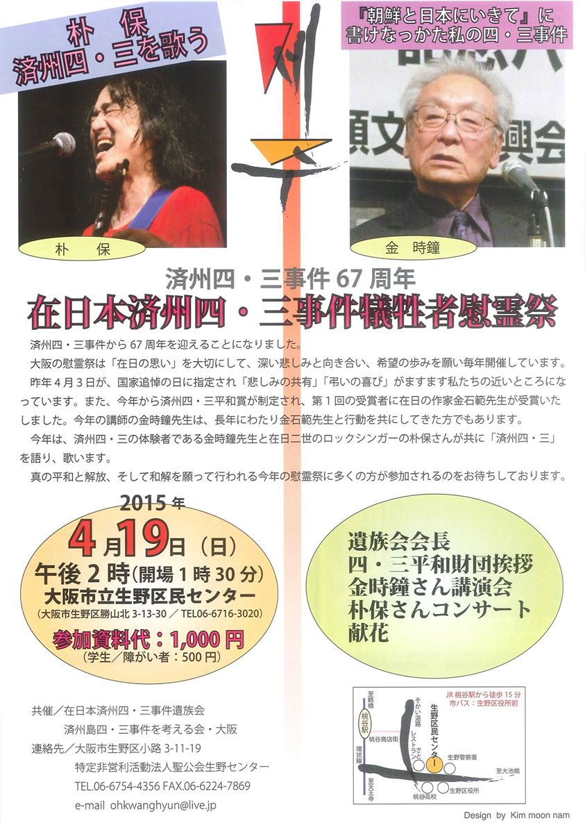 済州四・三事件から67周年…金時鐘さんの語りと朴保さんの歌は、済州四・三の悲しみを抱き、自由・解放・への歩みを更に確かなものにすることを確信する。